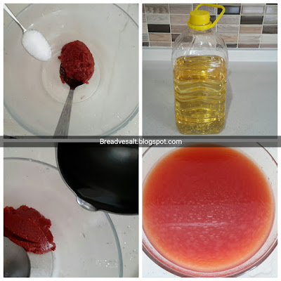 | Put 1/2 cup of water, a tablespoon of tomato paste, a pinch of salt and 1 / 2 Tablespoon of vegetable oil into a bowl and mix all of them well, |